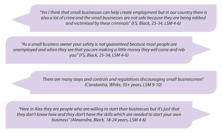 Similar sentiments also came to the fore during DoC Tracker Research. A number of low living standards measure (LSM) respondents expressed interest in starting their own businesses; however felt they were held back by a lack of knowledge and resources. Respondents in the high LSM groups also shared these views, indicating they needed financial support to sustain their businesses. Youth across the world face some of the obstacles South African youth face. International studies have found that the correlation between age, the economy and start-up businesses’ lack of financial assistance, and access to credit explain the lack of interest in entrepreneurship. For example, a Kauffman Foundation study associated low interest in starting a business with being young and lacking financial assistance, while the youth in the Eurobarometer blamed it on a lack of access to credit for their start-up businesses. It is commonly believed that the younger people are, the lower their interest in entrepreneurial activities will be but that as they get older, they are more likely to want businesses of their own. In a piece titled “Why So Few Young People Start Businesses” in Bloomberg Business Week of 29 June 2010, Scott Shane points out that “since the vast majority of businesses receive no start-up capital from anyone other than the founder, potential entrepreneurs need to have enough money to cover their start-up costs, and are most often deterred from starting companies if they lack adequate capital”.